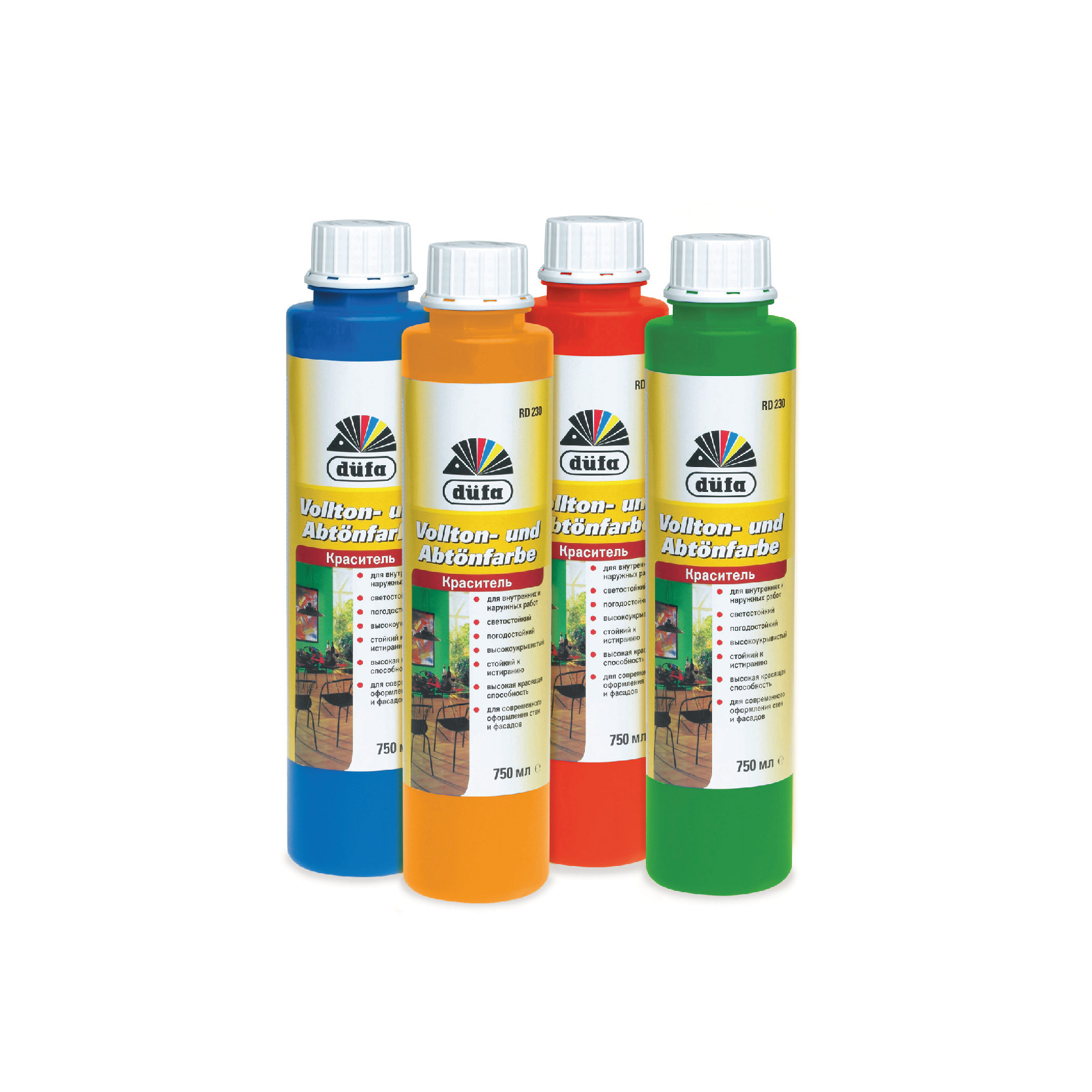 “Dufa Vollton- und Abtonfarbe” ir augstas kvalitātes, universāla tonēšanas krāsa, kas paredzēta gan dispersijas krāsu tonēšanai, gan patstāvīgai lietošanai.